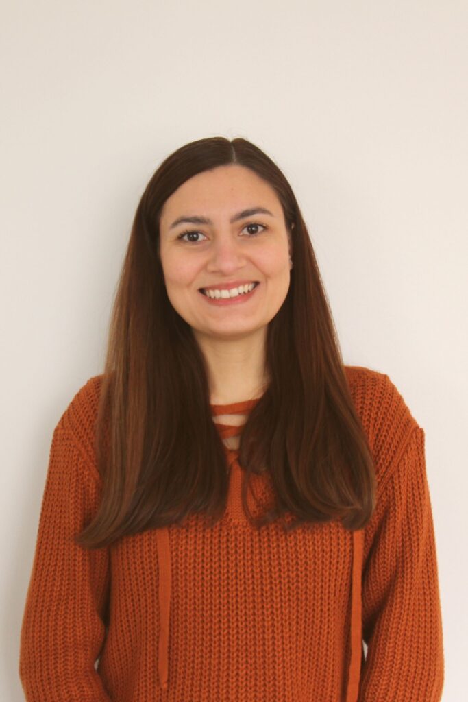A smiling woman with long brown hair is wearing an orange knitted sweater. She stands against a plain white background, representing the values of Friday Health.